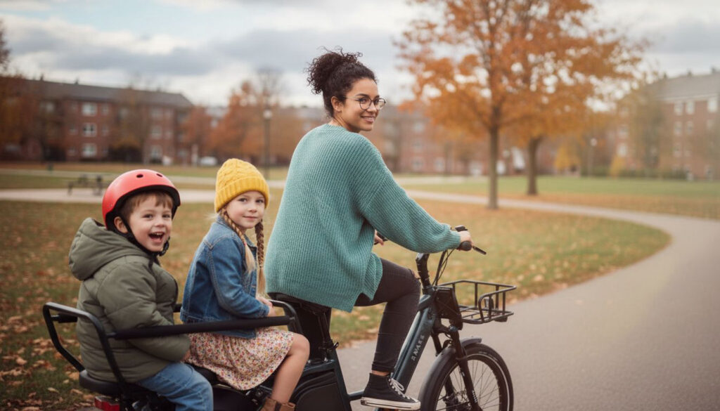 Reflecterende vlaggen en extra verlichting zorgen dat je beter zichtbaar bent, zeker als je met kinderen onderweg bent in het donker of bij slecht weer. De brede middenstandaard houdt de fiets stabiel bij op- en afstappen, ook met twee kinderen en volle tassen aan boord.